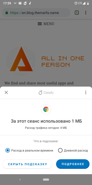 При работе в мобильной сети можно вручную или автоматически включить подсказку о трафике. Здесь реальном времени отображается трафик используемого приложения за день или в течение сессии. По тапу на подсказку можно посмотреть подробный график расходов.