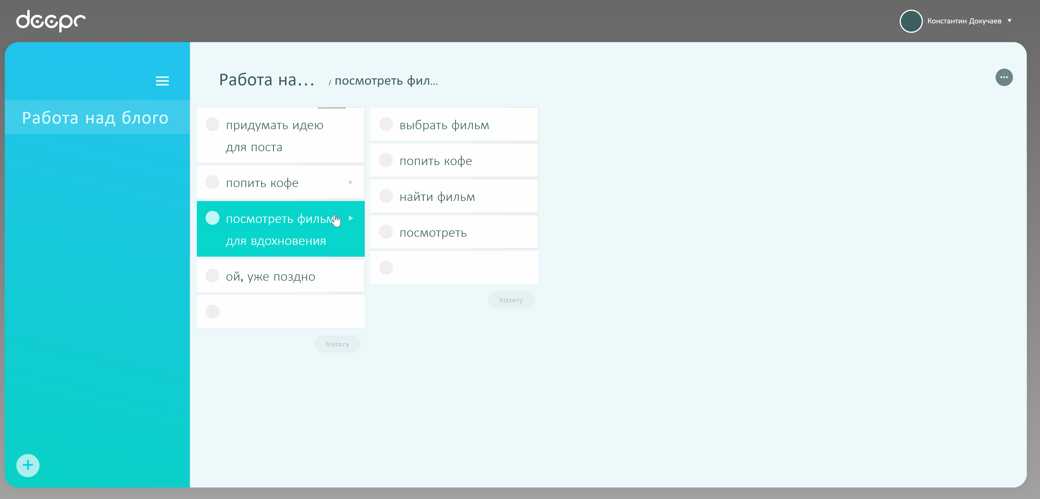На левой панели располагаются проекты. А справа — задачи. «Фишка» deepr в том, что задачи располагаются вертикально, сверху вниз. При клике на задачу открывается её подзадача. При клике на подзадачу — её подзадача. И так, пока не надоест.
