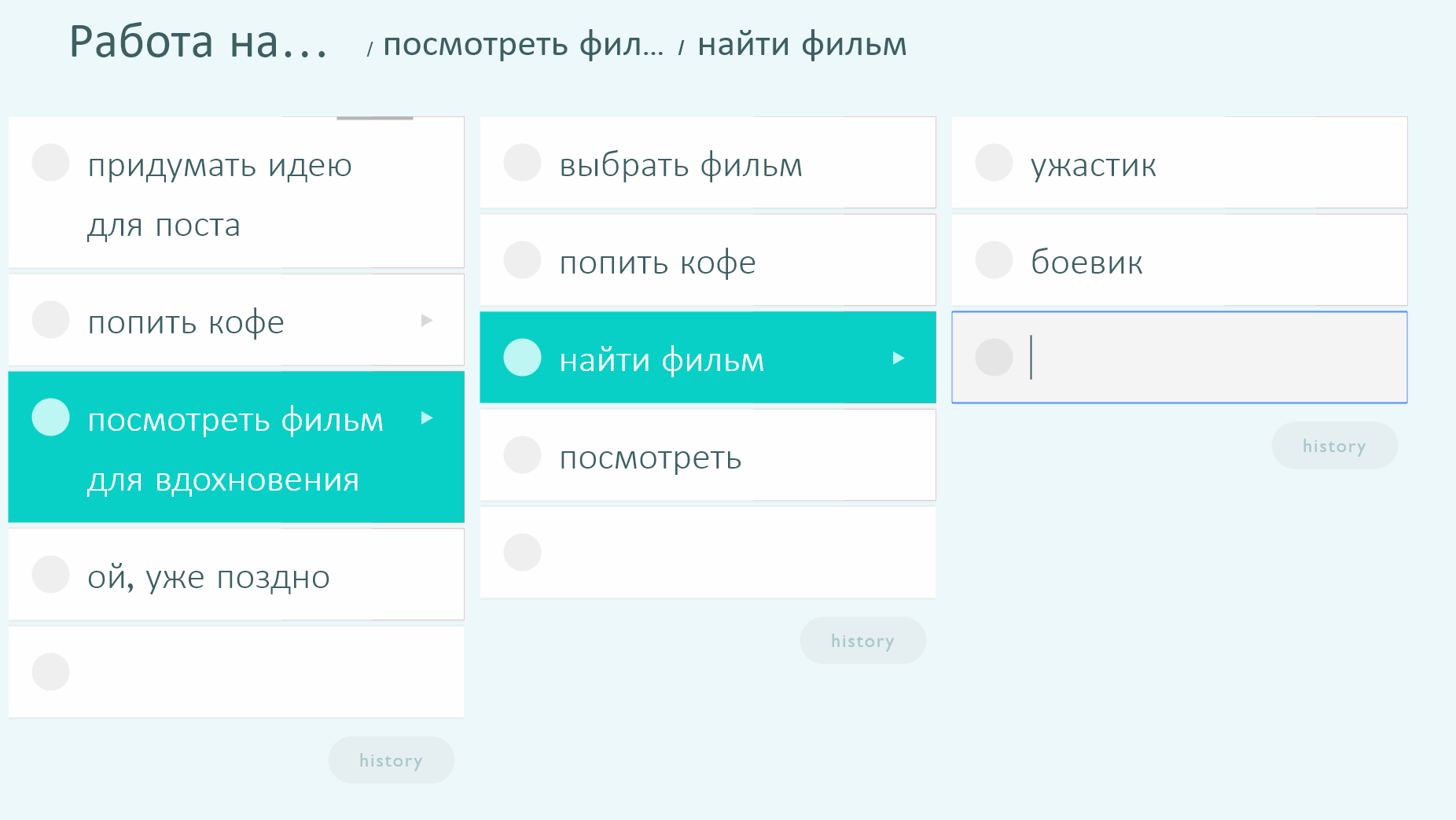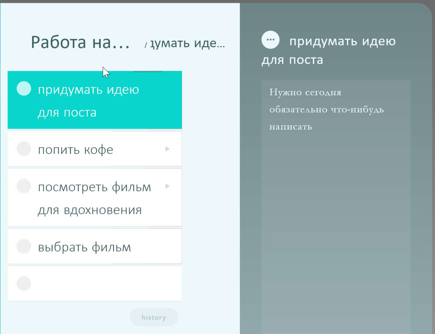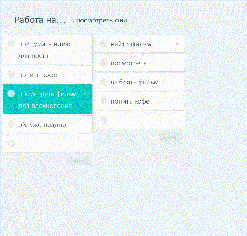 Все завершённые задачи скрываются с главного экрана и доступны для просмотра или восстановления при нажатии на кнопку «history». Задачи легко перемещаются между проектами и другими задачами.