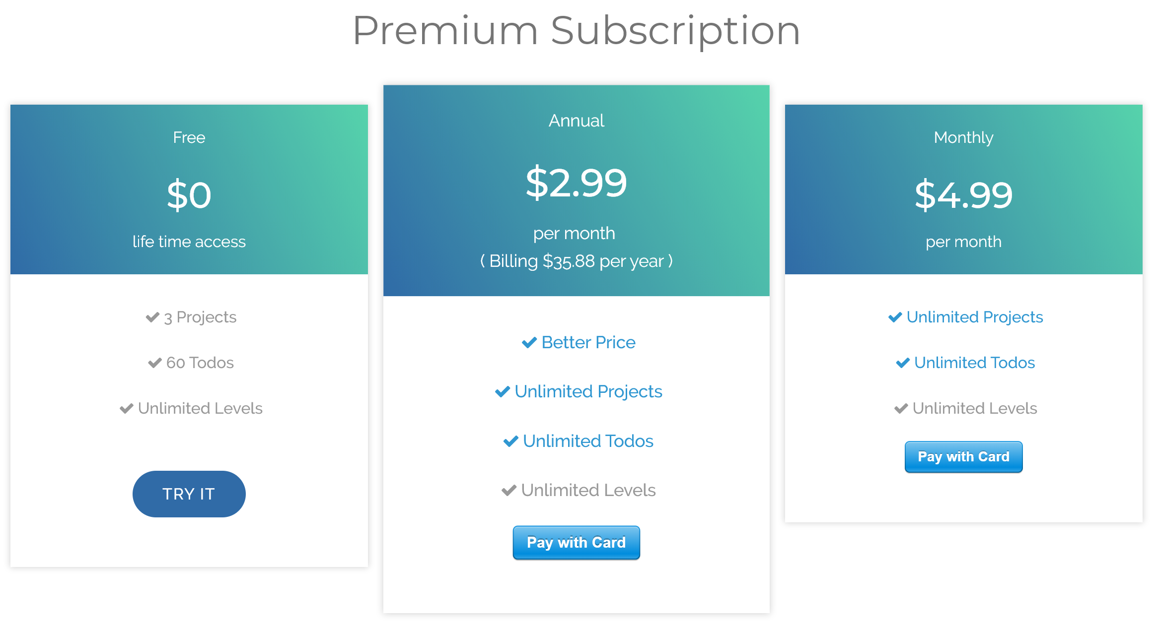 Для любителей потратить деньги сервис предлагает три тарифных плана. На бесплатном доступно 3 проекта, 60 задач, любое число уровней. На платных тарифах никаких ограничений нет.