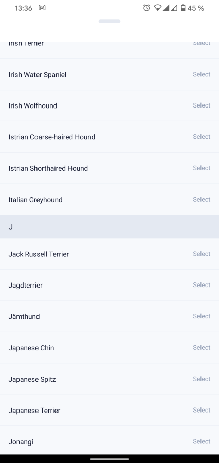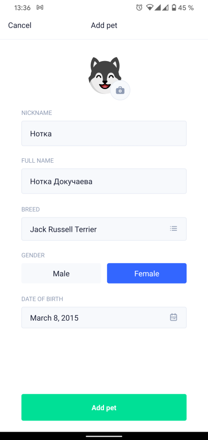 Заполнить можно только поле с кличкой, либо все поля. В базовой анкете это: аватар, кличка, полное имя, порода, пол и дата рождения. Порода выбирается из списка. Из минусов — нет поиска и все породы на английском. Плюсы — есть все (или почти все) породы.