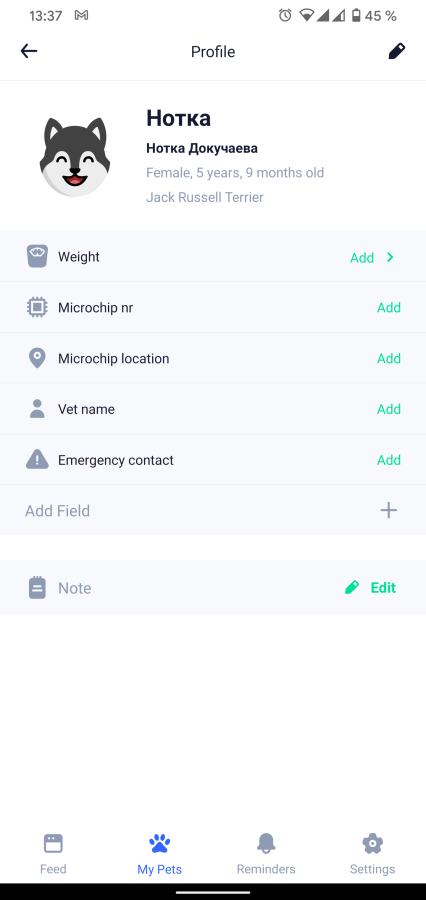 В самой анкете вы сможете заполнить дополнительную полезную информацию или отредактировать старую. Среди новых полей появляются данные о весе, чипировании и месте чипирования, имя ветеринара, экстренные контакты и заметки. Также можно добавлять любые свои поля.
