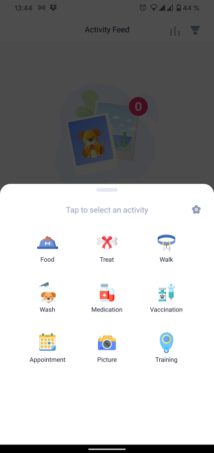 При нажатии на плюсик вы выбираете активность. Это может быть: кормёжка, поощрение, прогулка и многое другое. Указываете, с кем из собак была произведена процедура и во сколько, добавляете комментарий, фото. И всё. Активность появляется в ленте.