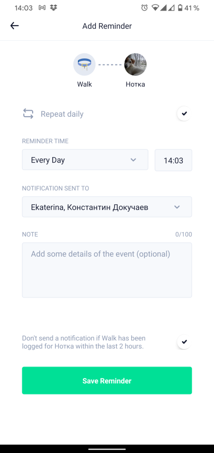 Вот она вкладка для назначения дел и исполнителей. При добавлении напоминания (дела) вы указываете собаку и тип активности для неё. Затем можно указать повторяемость активности (только ежедневную), время напоминания, указать, кто получит напоминания, и добавить заметку.