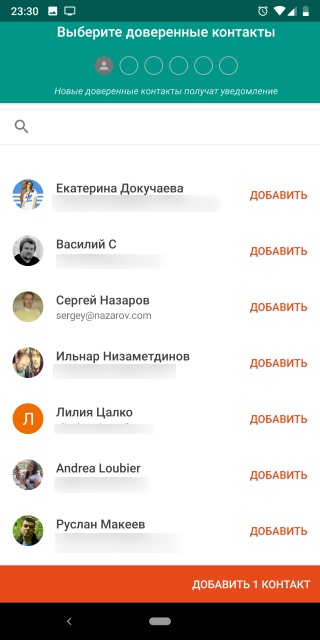 Первоначальная настройка очень простая. Для начала у вас и у ваших родных должно быть установлено приложение. Затем нужно добавить друг друга в список доверенных контактов. Для этого просто выбираем их из адресной книги и жмём Добавить.