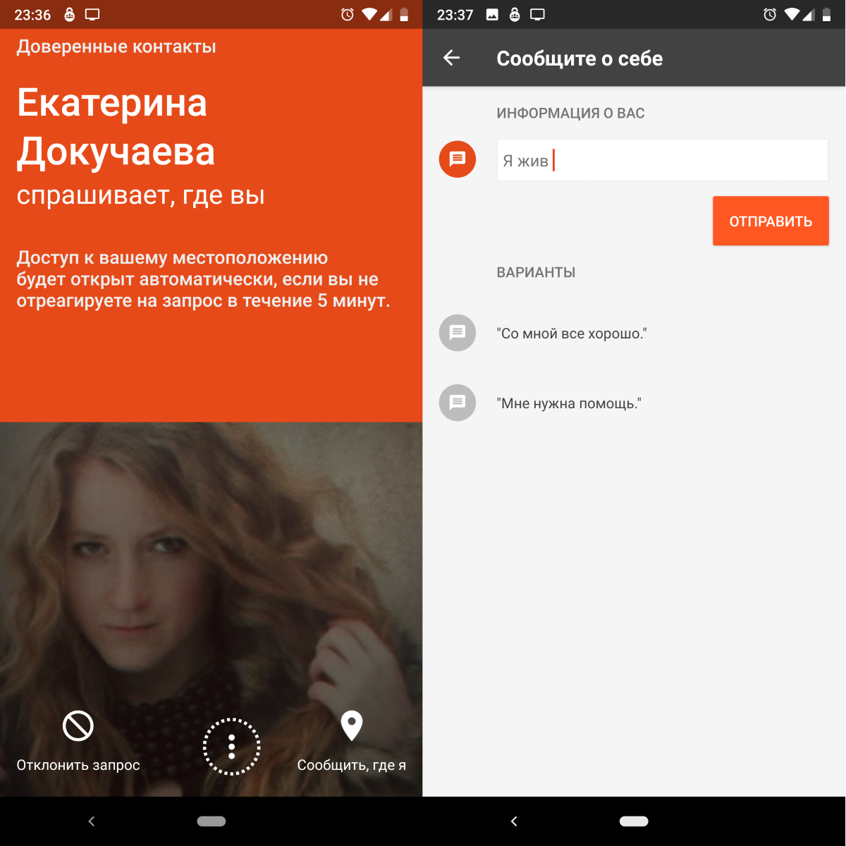 Когда у вас запрашивают местоположение это выглядит как звонок, но вместо возможности взять трубку, вам предлагают передать данные о геолокации. При этом вы можете выбрать один из двух вариантов ответа «Со мной всё хорошо», «Мне нужна помощь» или отправить своё сообщение. Запрос также можно отклонить.