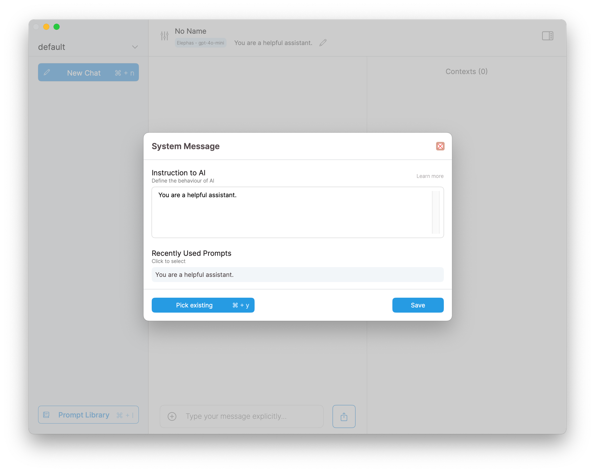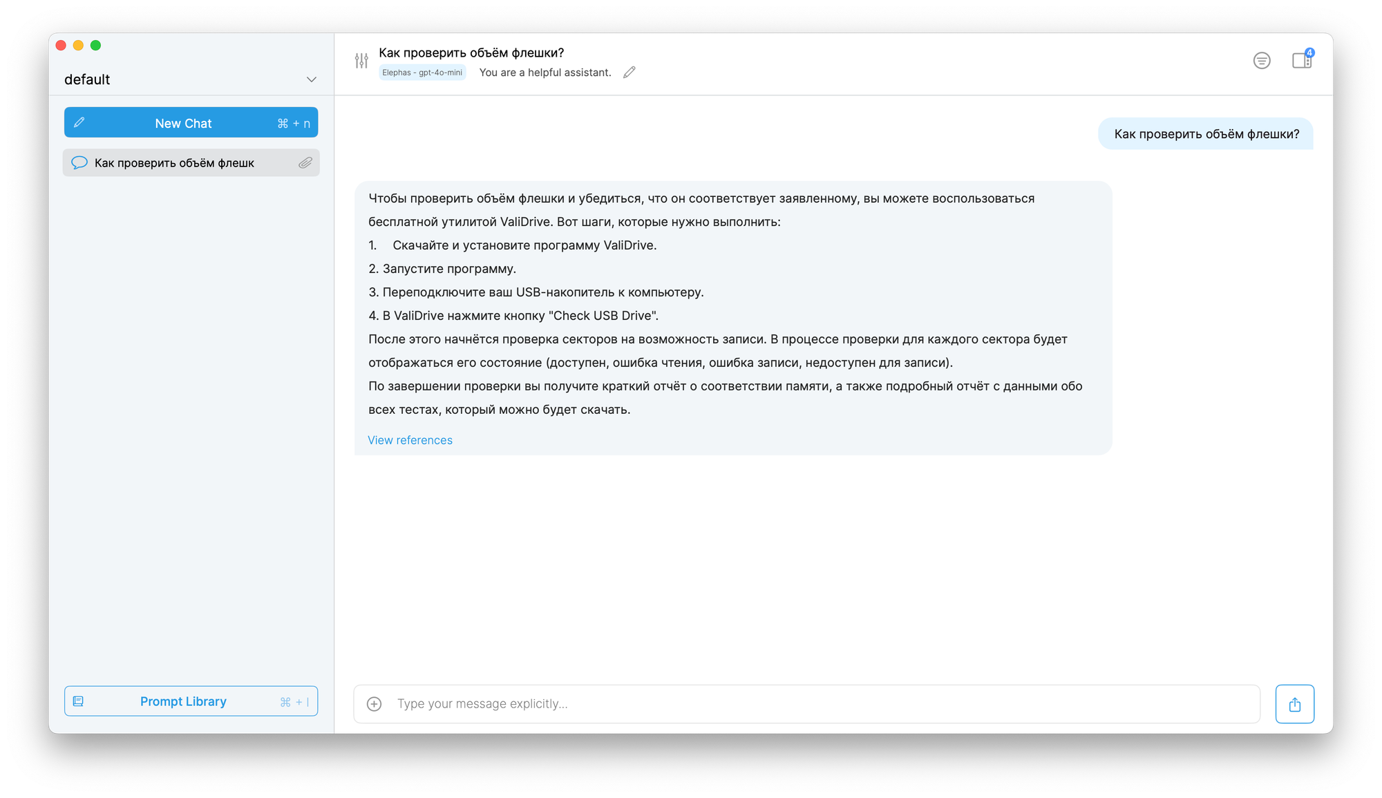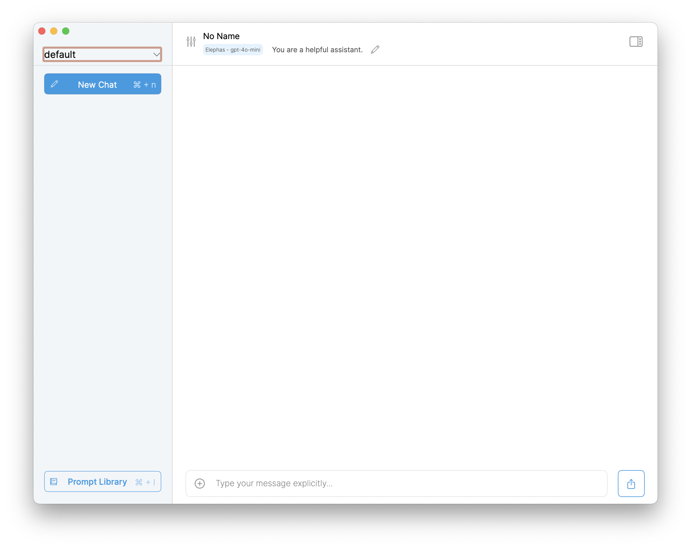 На первый взгляд, Elephas ничем не отличается от обычного ChatGPT. У вас есть две панели: левая со списком чатов, правая непосредственно с самим чатом.