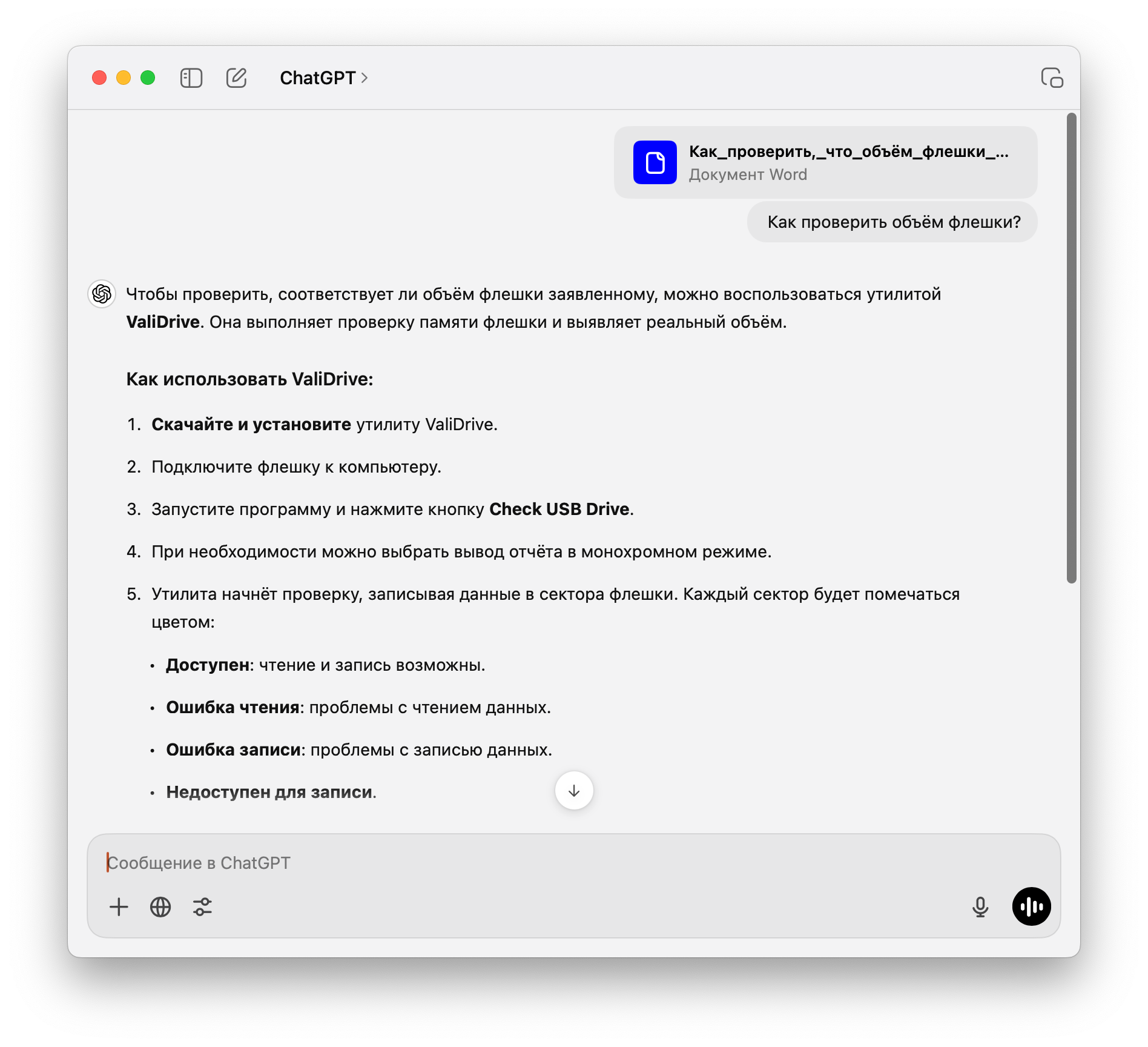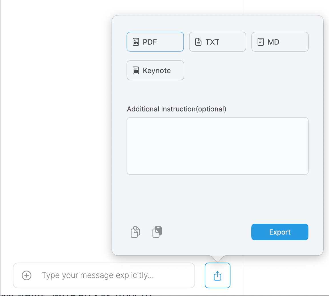 Беседу можно экспортировать. В этом случае поддерживаются форматы PDF, TXT, MD и Keynote. При этом вы можете к итоговому документу добавить дополнительные инструкции.