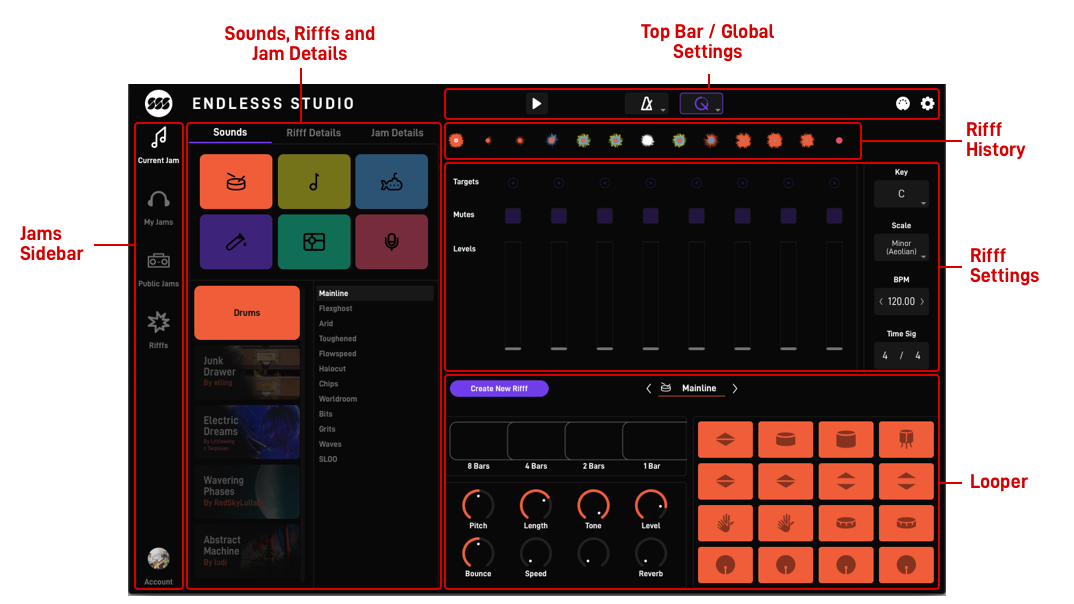 Endlesss Studio — это мощный многодорожечный лупер со встроенными инструментами воспроизведения, подключённый к облаку и позволяющий быстро генерировать идеи и сотрудничать с другими пользователями со всего мира.