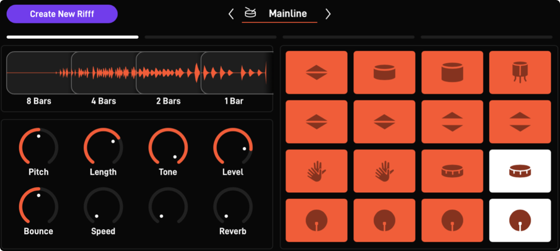 Rifff — это состояние всех 8 слоёв, включая луп в каждом, уровень каждого и любые дополнительные настройки, такие как темп, тональность и тактовый размер. Каждый раз, когда вы добавляете или ремиксируете слой, создаётся новый рифф. Если вы регулируете громкость в микшере или осуществляете какие-либо дополнительные настройки, нажмите кнопку «Create New Rifff», чтобы создать новый рифф с этими настройками.