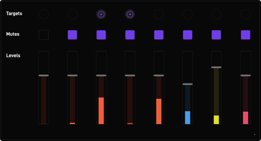 В микшере вы также можете найти переключатели Target, которые определяют маршрутизацию различных слоёв к FX и сэмплеру. По умолчанию Endlesss Studio всегда будет выбирать последний добавленный слой. Однако вы можете настроить нацеливание на FX или сэмплер любой комбинации слоёв.
