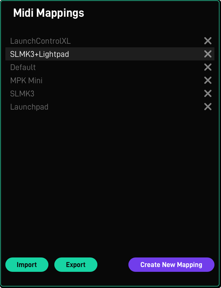 Если хотите поделиться своим маппингом с другими пользователями или собираетесь использовать маппинг, созданный кем-то другим, можете сделать это с помощью функций импорта/экспорта. Для экспорта маппинга просто нажмите «Export» и укажите, куда его сохранить. При этом будет создан файл .midiprofile, которым вы сможете поделиться с другими пользователями. Для импорта нажмите «Import» и выберите .midiprofile, который вы хотите использовать.
