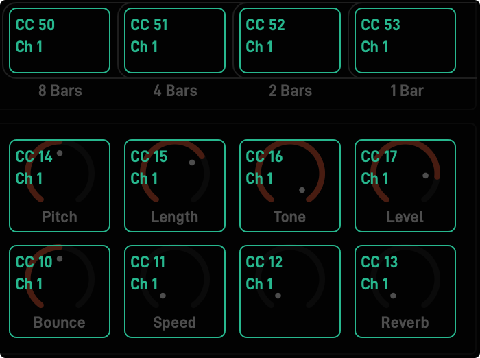 В режиме MIDI Mapping любой параметр, который может иметь MIDI-назначение, будет выделен зелёным прямоугольником. Чтобы создать назначение, просто нажмите на параметры, а затем переместите оборудование MIDI, которое вы хотите назначить. Как только оно будет назначено, вы сможете просмотреть MIDI CC/MIDI noteи номер используемого канала.