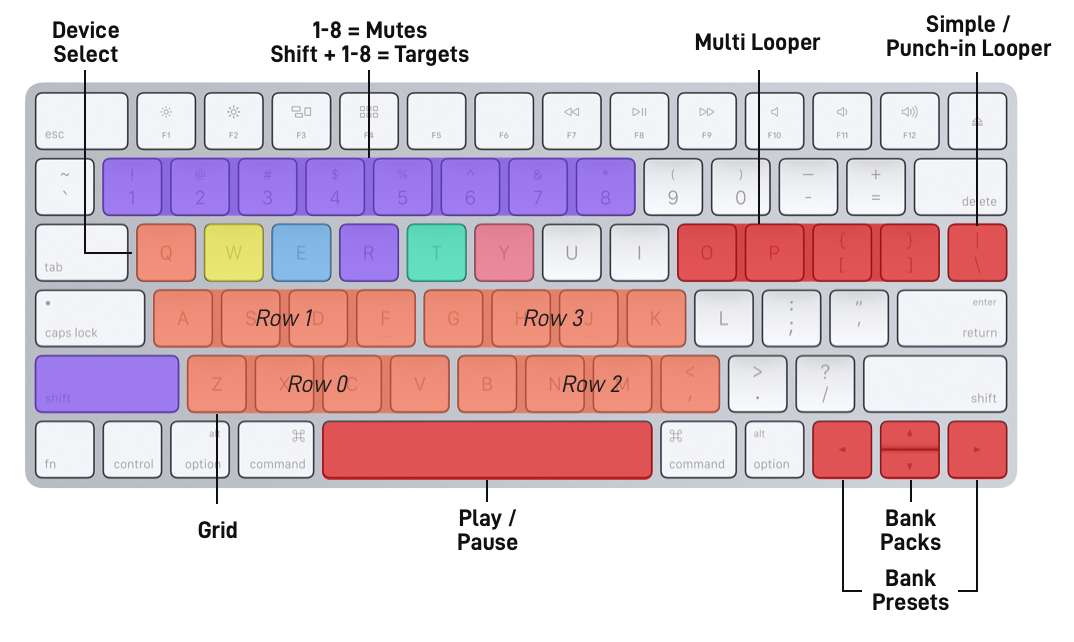 Чтобы можно было быстро управлять функциями Endlesss Studio (даже без MIDI-контроллера), клавиатура компьютера автоматически подключается к Endlesss. На представленной ниже схеме приведено соотнесение клавиш клавиатуры с назначаемыми им функциями.