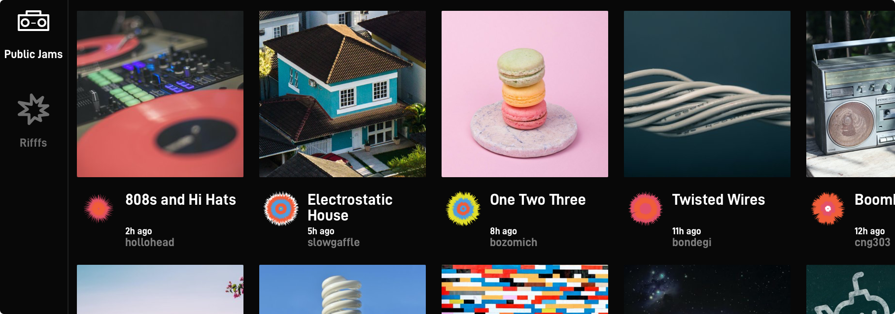 Выбрав «Public Jams», вы сможете просмотреть все последние общедоступные джемы. Если вы выберете любой из них, вы немедленно перейдёте в Jam и сможете начать общаться и создавать риффы совместно с другими пользователями.