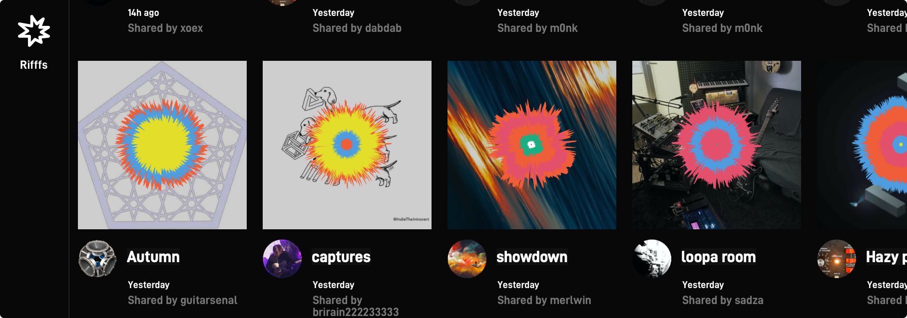 На платформе Endlesss есть лента Rifff, в которой показаны все последние и самые популярные риффы. Вы тоже можете поделиться своей работой с другими пользователями.