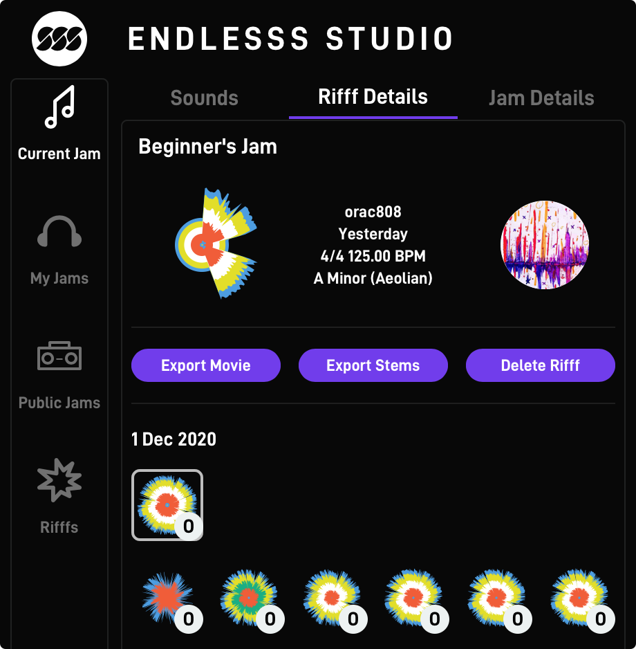 Если во время джеминга вы переключитесь на вкладку «Rifff Details», вы найдёте полную историю всех ваших риффов для джема, которые вы можете просмотреть и воспроизвести. При желании вы можете удалить риффы, которые вам больше не нравятся.
