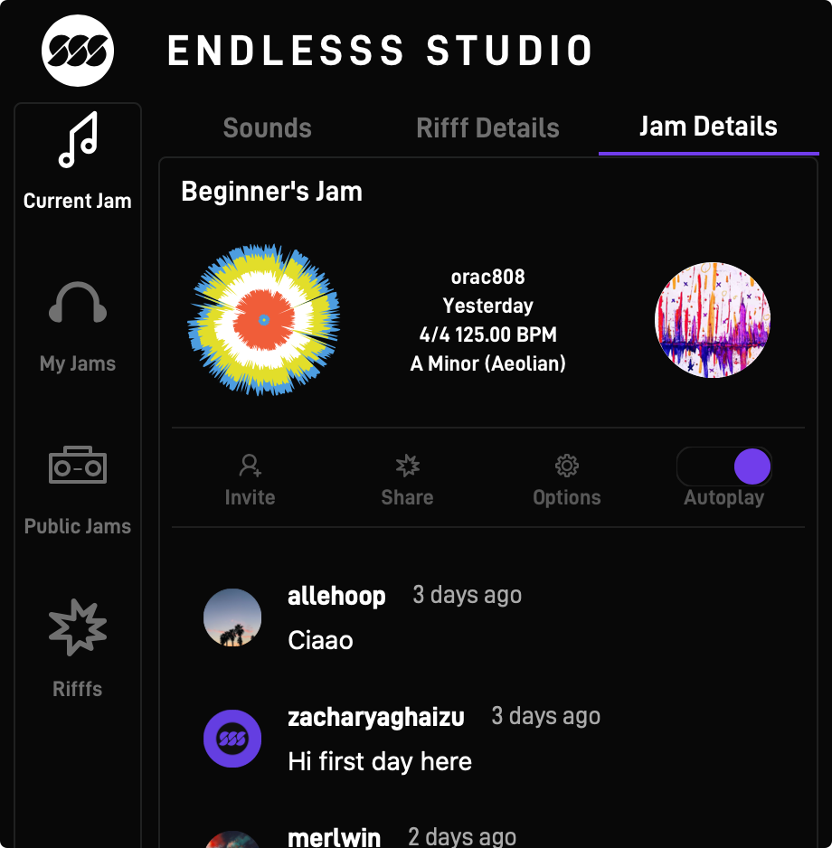 В разделе «Jam Details» вы можете пригласить пользователей присоединиться к вашему джему и пообщаться с ними напрямую, создавая вместе музыку.