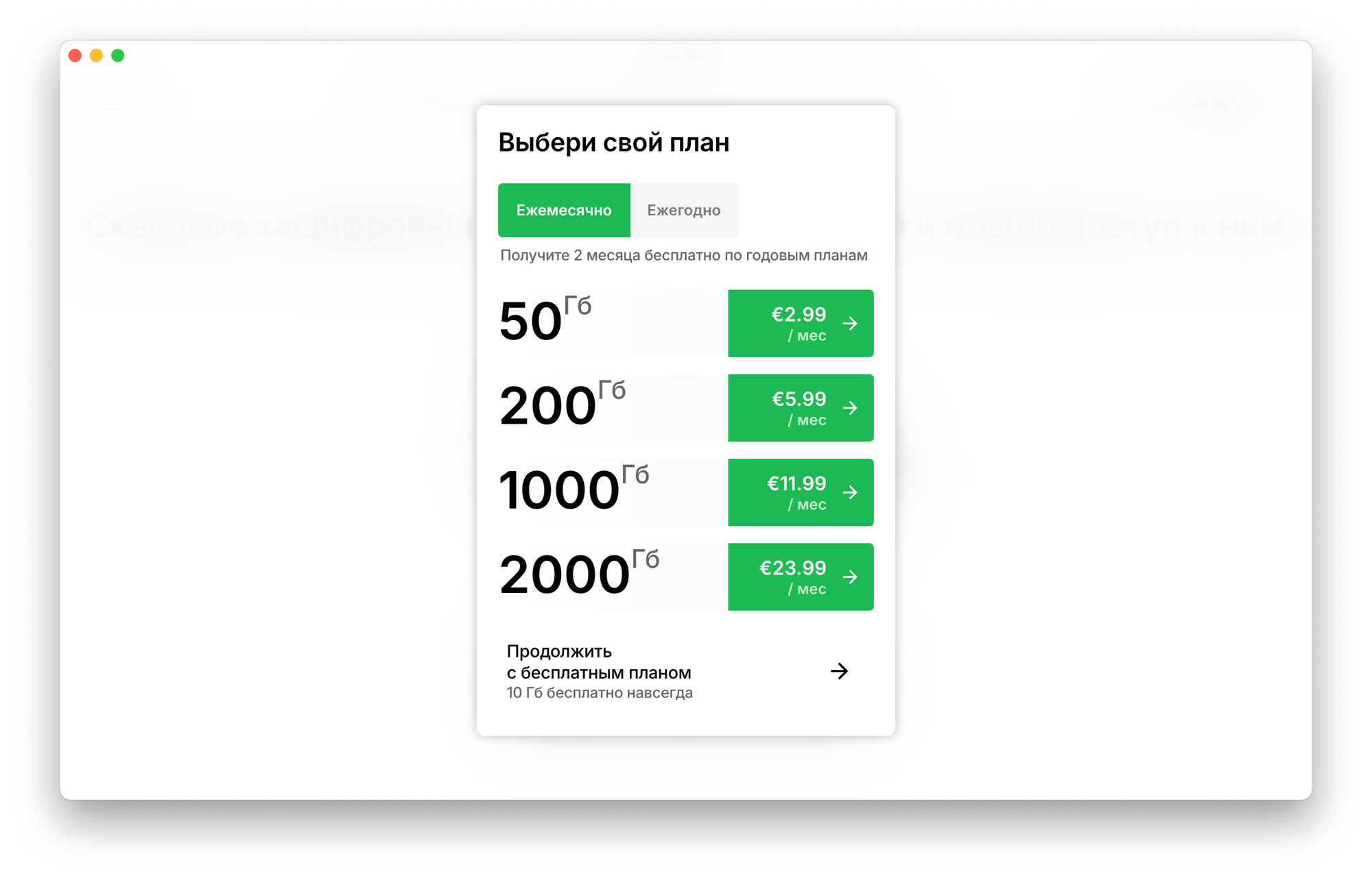 Пользоваться Ente можно бесплатно, но тогда облако будет ограничено 10 Гб. Если этого мало, всегда можно перейти на более объёмный тариф. Стоимость начинается от €2.99 в месяц за 50 Гб при оплате каждый месяц. Максимально доступный объём — 2 Тб.