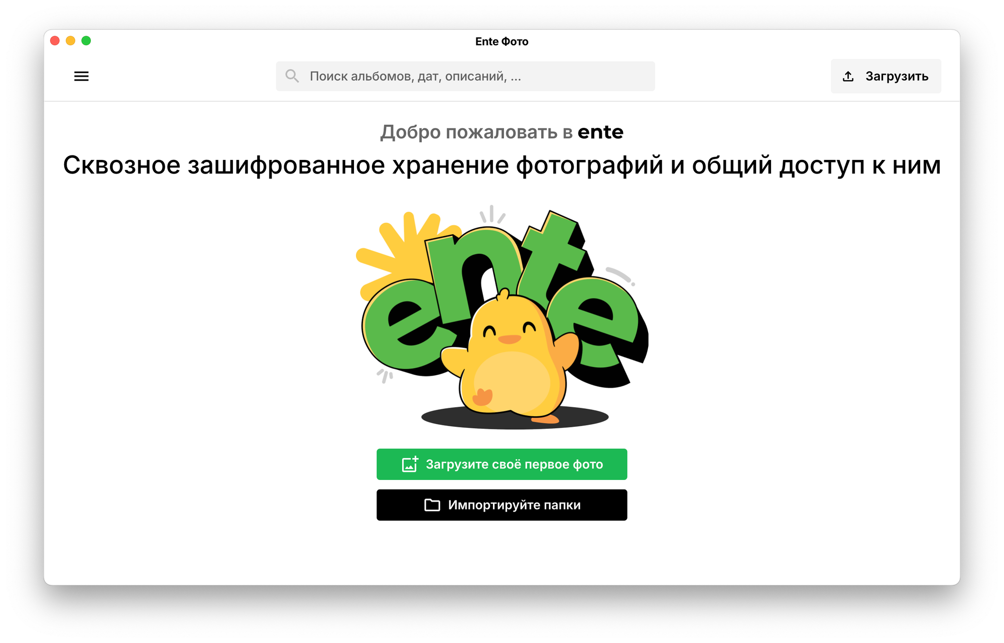После завершения регистрации вас ожидает стартовое окно Ente, в котором вас попросят загрузить ваши фоточки.