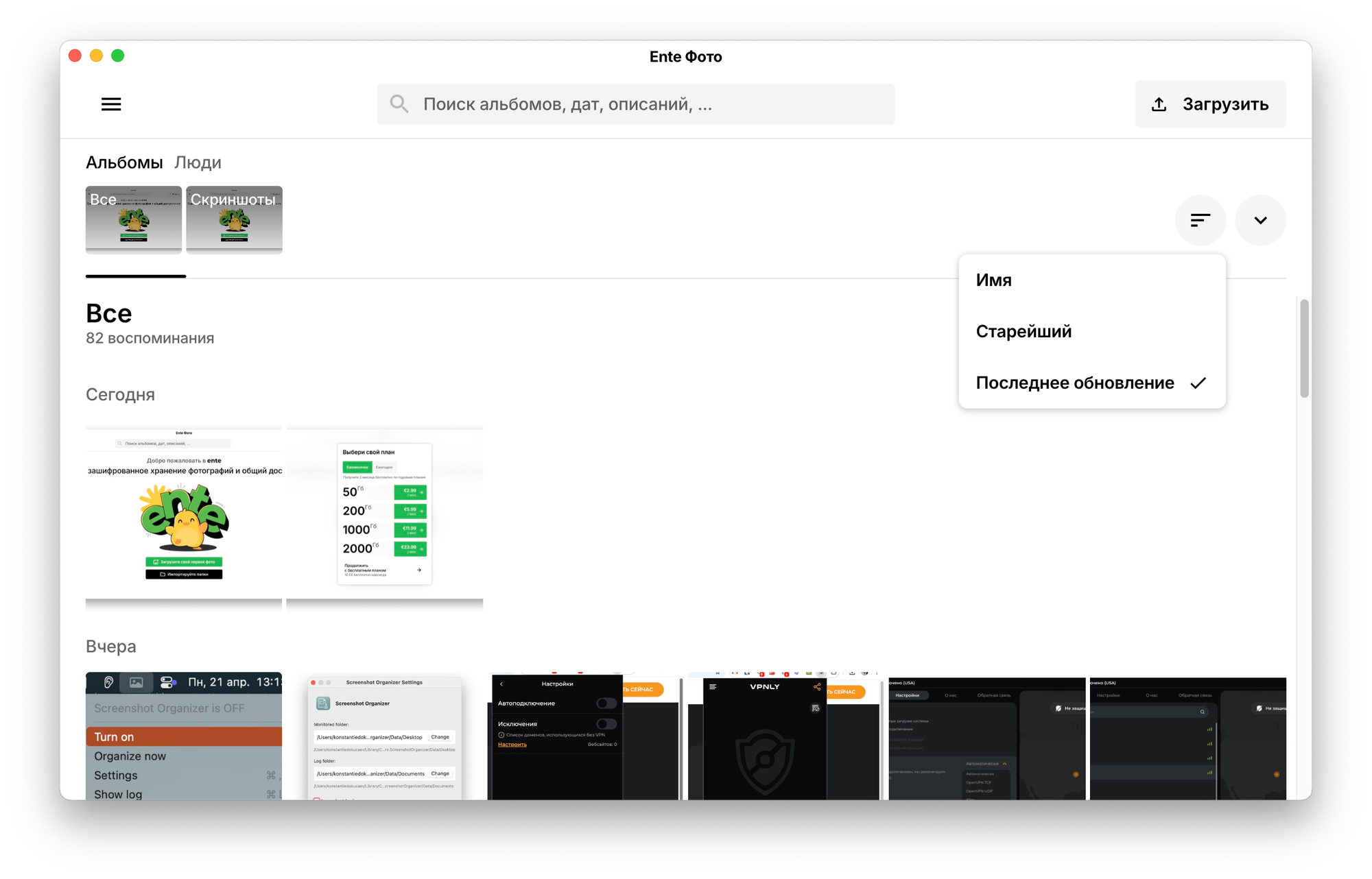 Добавлять файлы можно по отдельности или целыми папками, есть возможность импорта из Google. Ente автоматически не загружает файлы из выбранных папок. Поэтому актуализировать данные придётся самостоятельно.