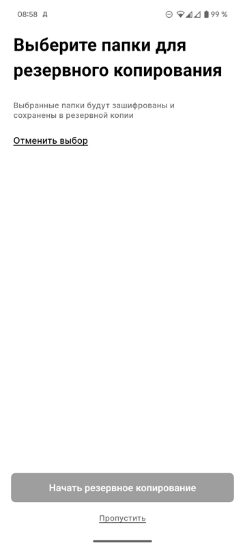 Правда, в версии для Android этап выбора папок для резервного копирования у меня забаговал, и выбрать папки или отменить выбор у меня не получилось. К счастью, этот этап можно пропустить, а папки добавить вручную позже.