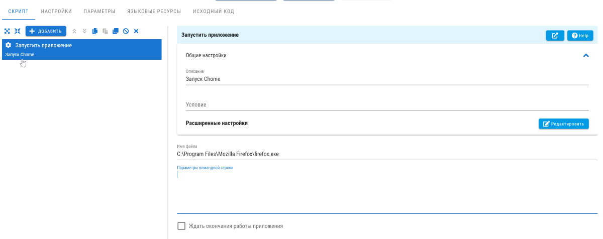 Например, можно добавить блок Запустить приложение. А в его настройках указать запуск браузера Firefox. В пункте Имя файла нужно указать путь до исполняемого файла. В разделе Параметры командной строки можно указать, с какими параметрами нужно запустить приложение. А в разделе Условие с помощью Конструкции Если указать дополнительные условия, которые нужно соблюсти до запуска.