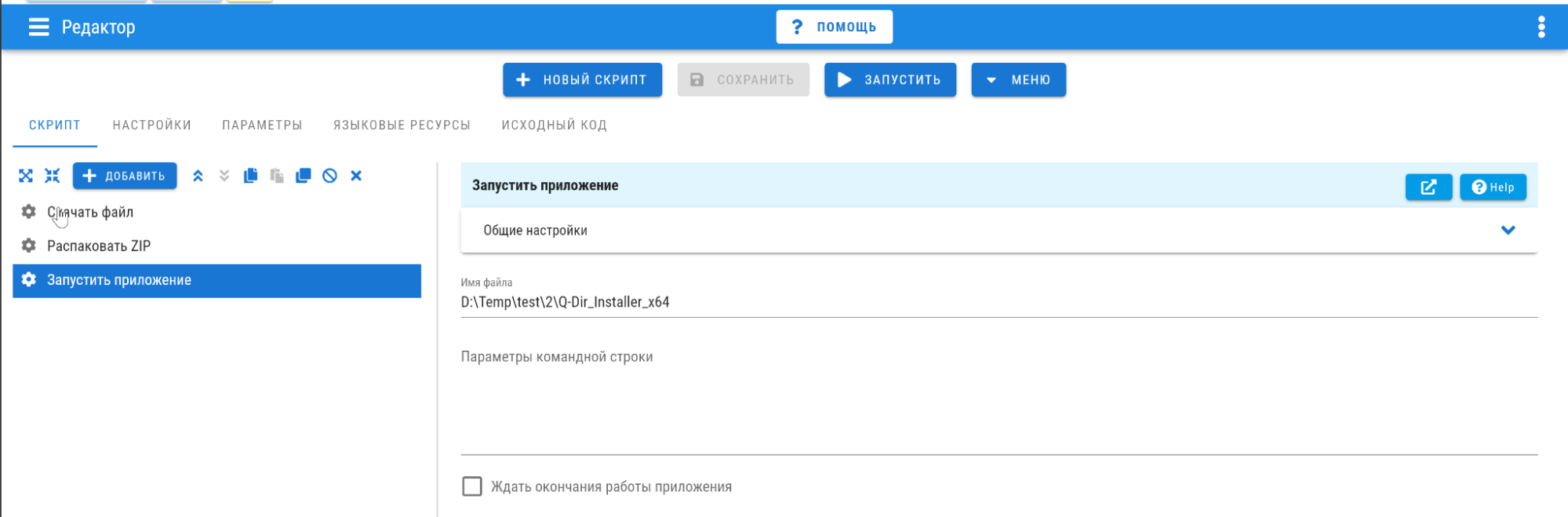 И в конце я добавляю блок Запустить приложение, где указываю путь к распакованному исполняемому файлу.