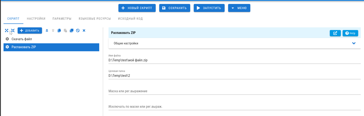 Затем я добавляю блок Распаковать ZIP, в котором я указываю путь до скачанного файла, папку для распаковки. При желании я могу указать регулярные выражения для более тонкой настройки скрипты.