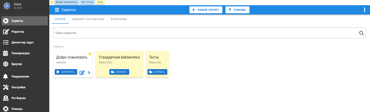 Если вы не знаете, с чего начать, и хотите вообще понять, как работает Eonza, то в приложении есть встроенная библиотека с популярными скриптами.