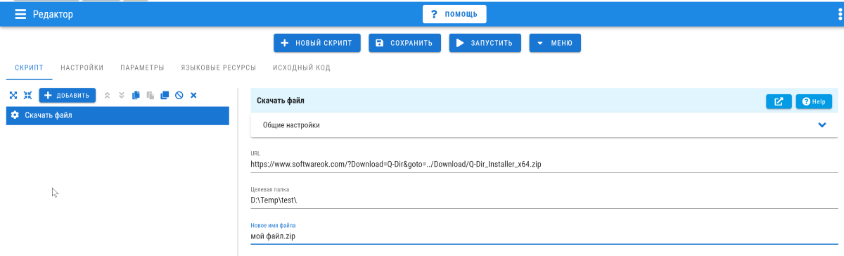 Для этого я добавляю блок Скачать файл, где указываю URL для этого файла, указываю папку для сохранения и имя файла с расширением.