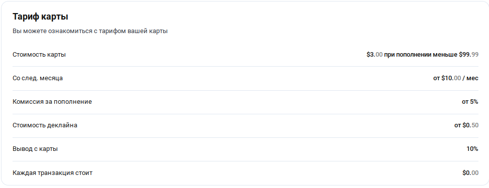 У каждой карты свои тарифы на пополнение, выпуск и траты. Поэтому рассказывать о них я не буду. Вся информация максимально подробно и понятно описана при выпуске карты.