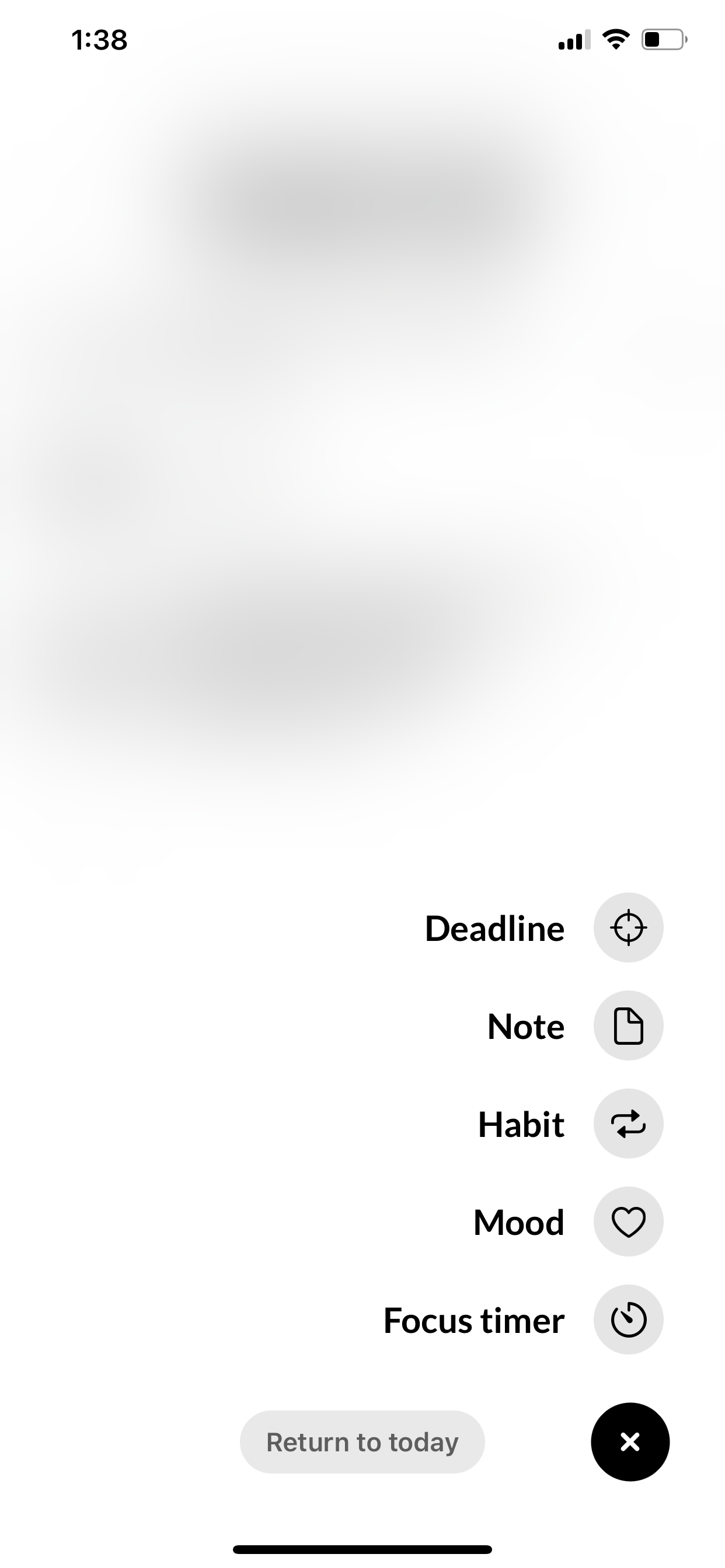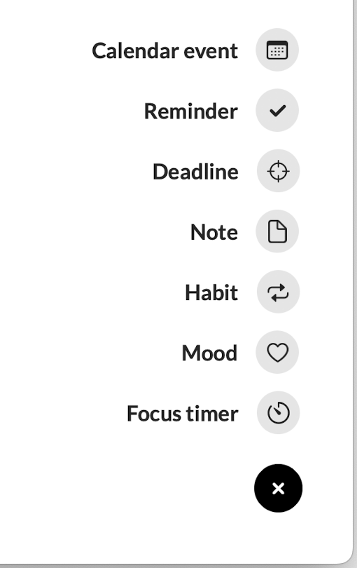 Чтобы добавить любую новую запись, нужно нажать на кнопку «+». Добавить можно: событие календаря, напоминание, дедлайн, заметку, привычку, настроение или таймер.