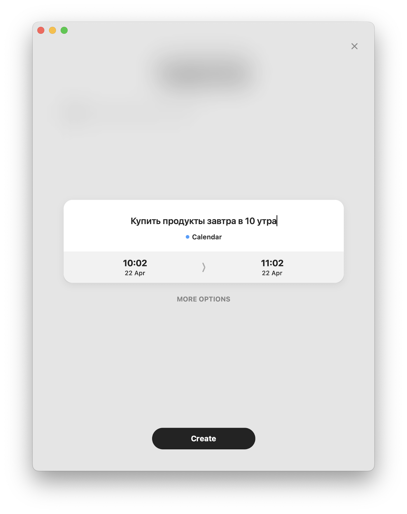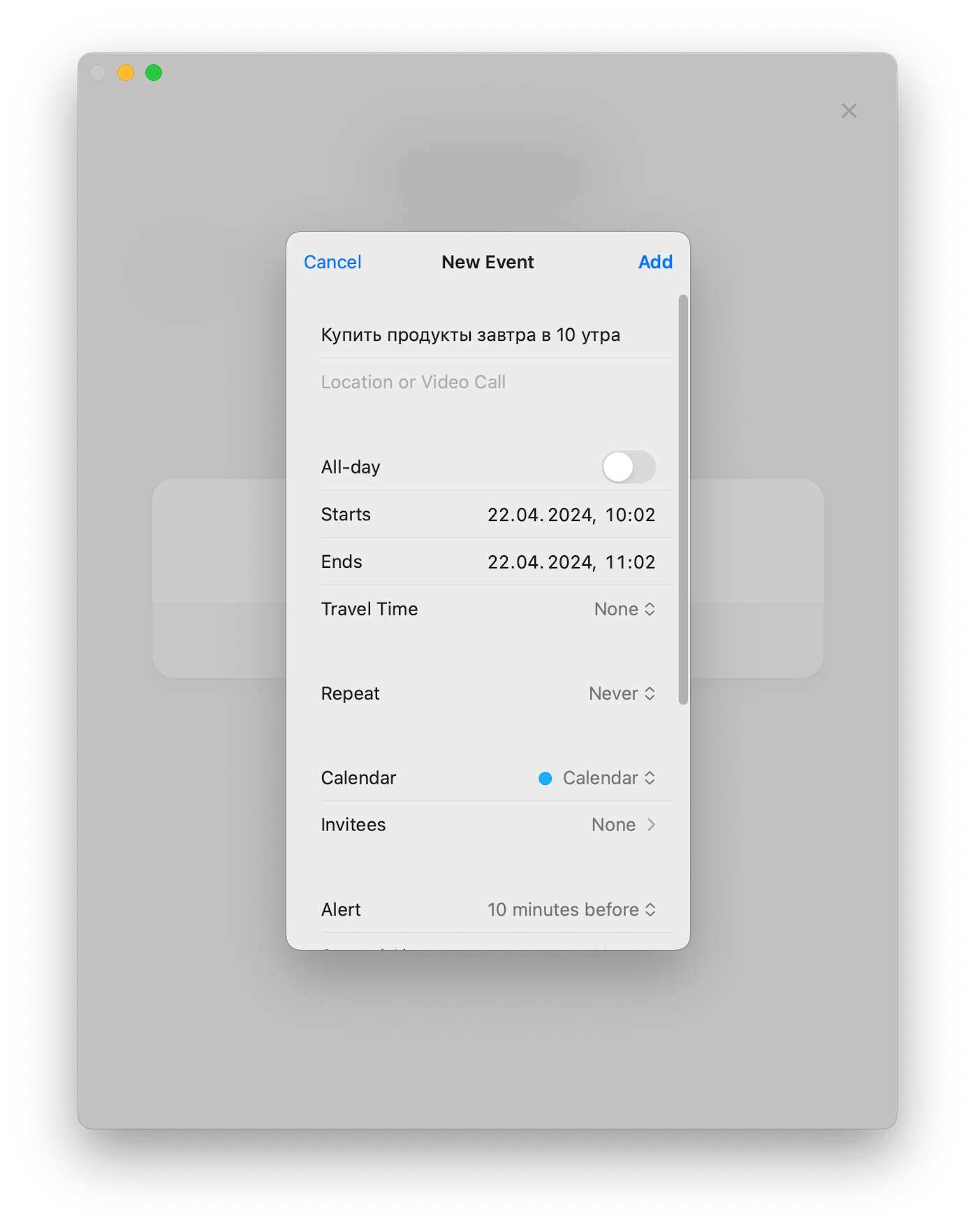 Добавление события так же выполнено в минималистичном виде. Вы указываете короткое описание, период выполнения и создаёте событие. В дополнительных настройках можно указать повторяемость, время поездки, выбрать календарь, пригласить коллег, установить напоминание или добавить заметку и ссылку на созвон.