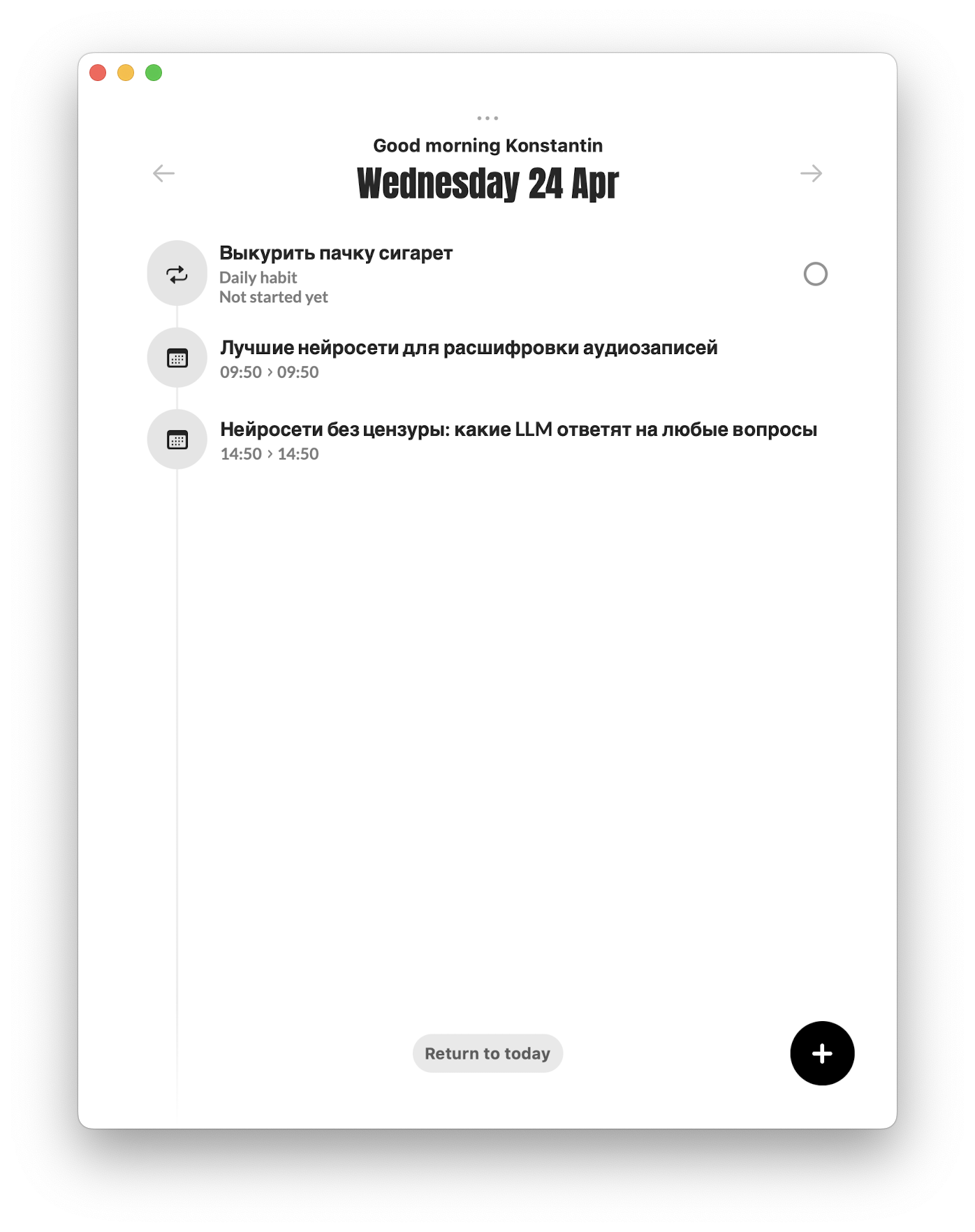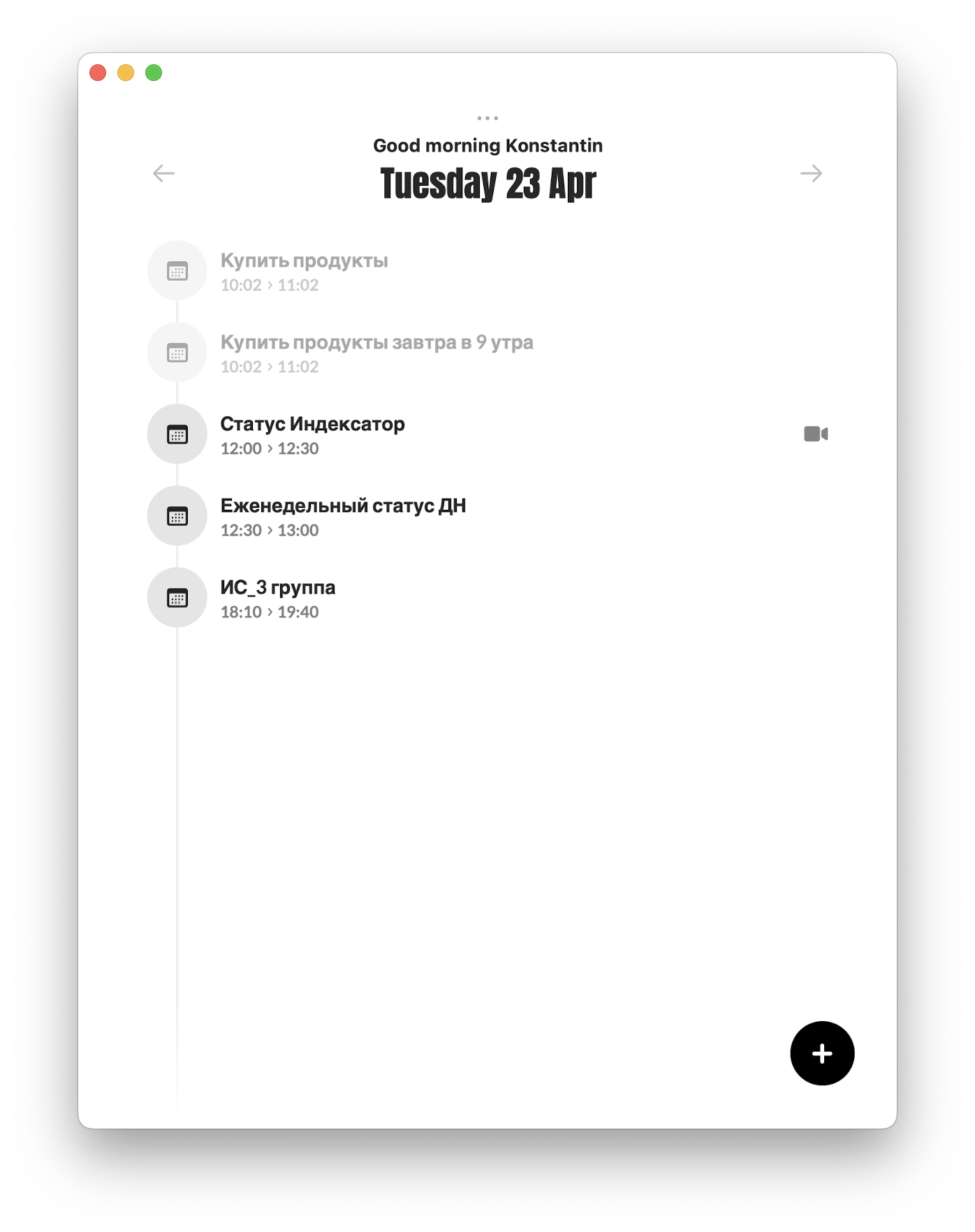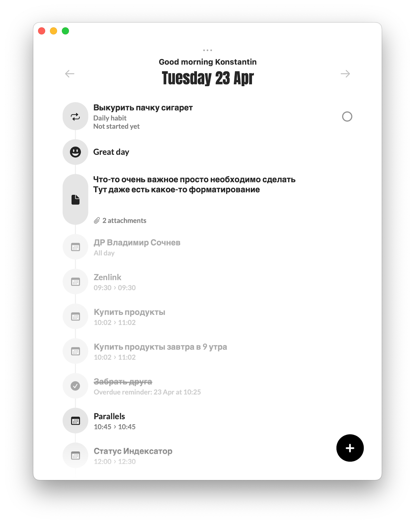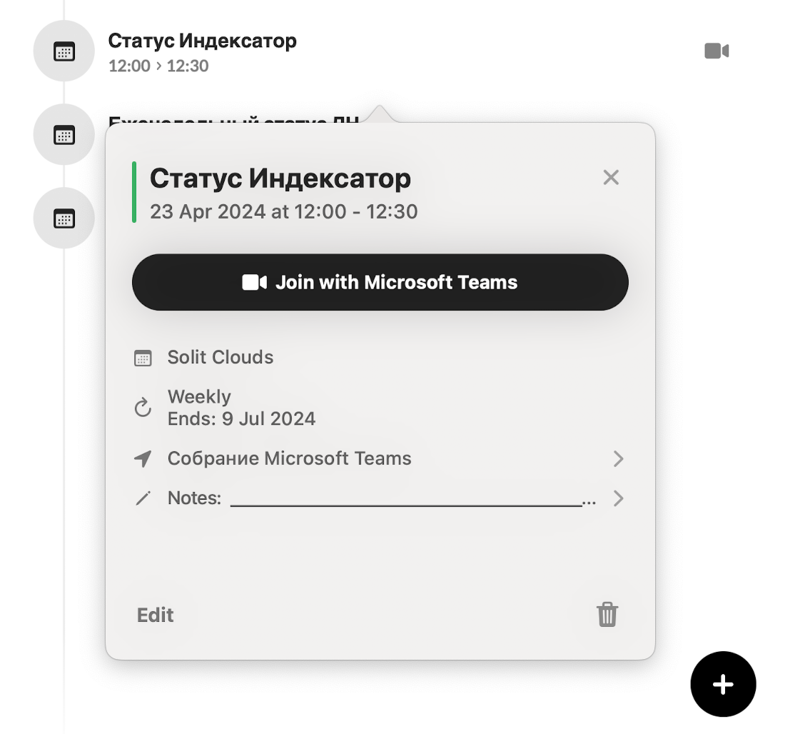 Все добавленные штуки можно отслеживать в основном окне Evo с возможностью переключения по датам. Отсюда можно перейти к карточке события или добавить новое.