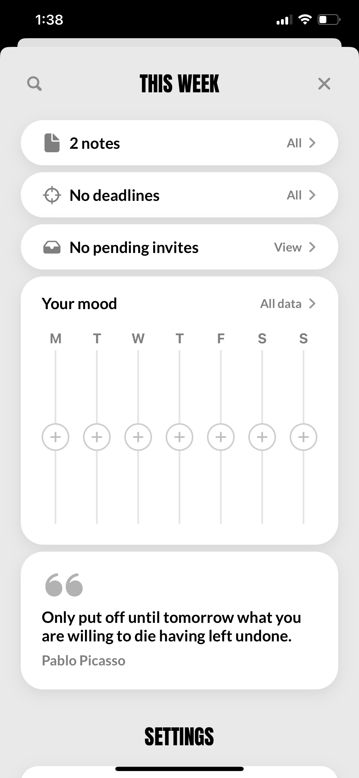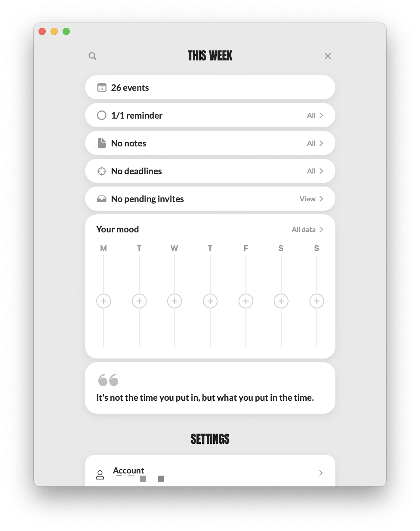 Здесь можно увидеть сводную статистику по вашим задачам, напоминаниям и прочим элементам приложения, включая статистику настроения. Также можно поменять дефолтные настройки напоминания, длительности мероприятий и общего дизайна приложения.
