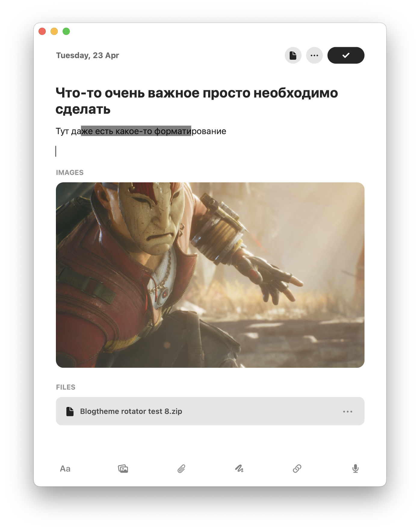 Редактор заметок на удивление продвинутый для подобного рода приложения. Есть базовое форматирование с поддержкой заголовков, вложений и диктовки текста. Заметку можно экспортировать в PDF и ZP формат, а также добавить к ней одну из пары десятков предустановленных иконок.