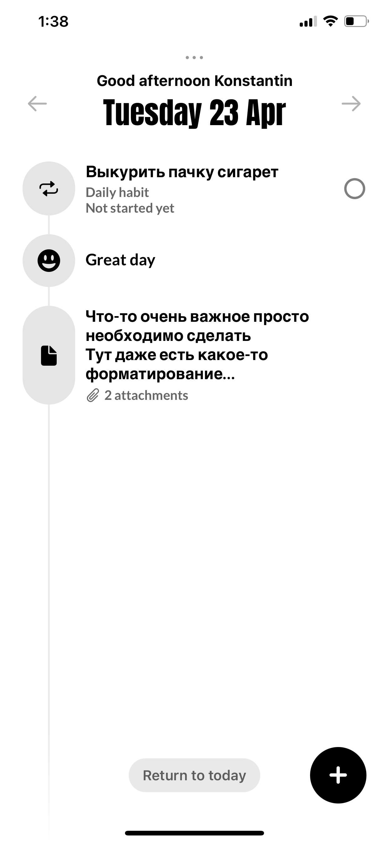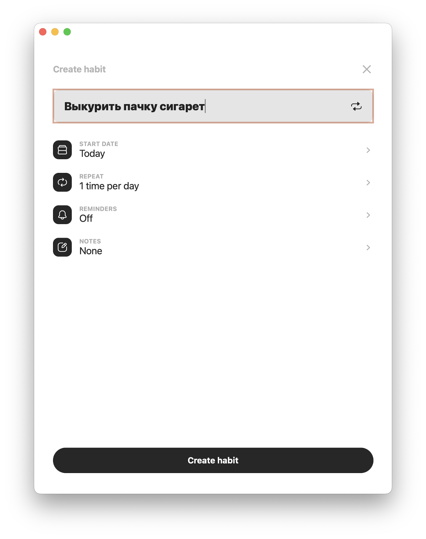 Если вам нужно выработать какую-то привычку, то её несложно добавить в Evo с указанием даты начала и повторяемости. Дополнительно можно добавить напоминания и заметку. Правда, в данном случае заметка может содержать только текст без форматирования и вложений.