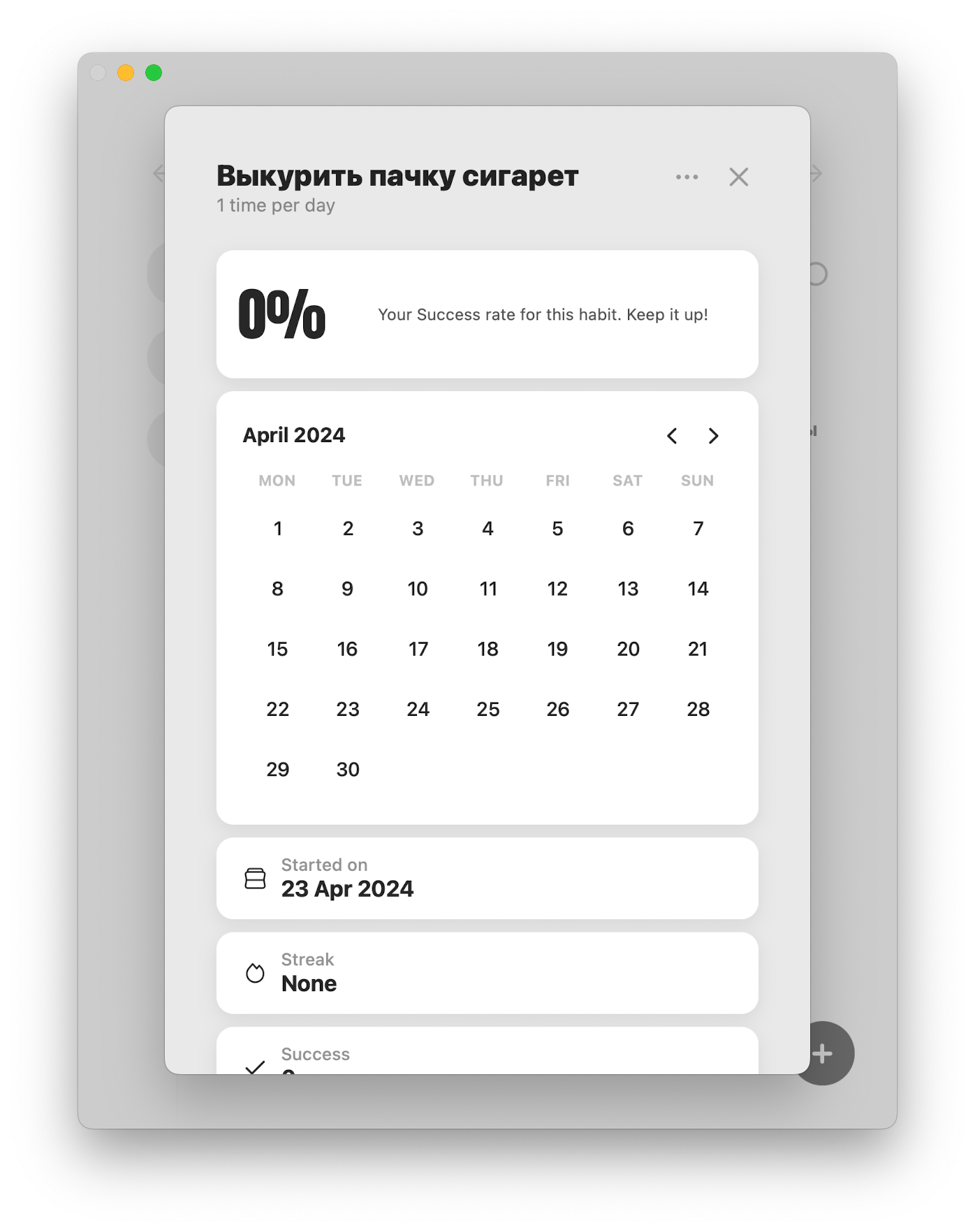 Затем из основного окна Evo можно пометить привычку выполненной на текущую дату. В самой карточке привычки можно отслеживать прогресс её выполнения или невыполнения.