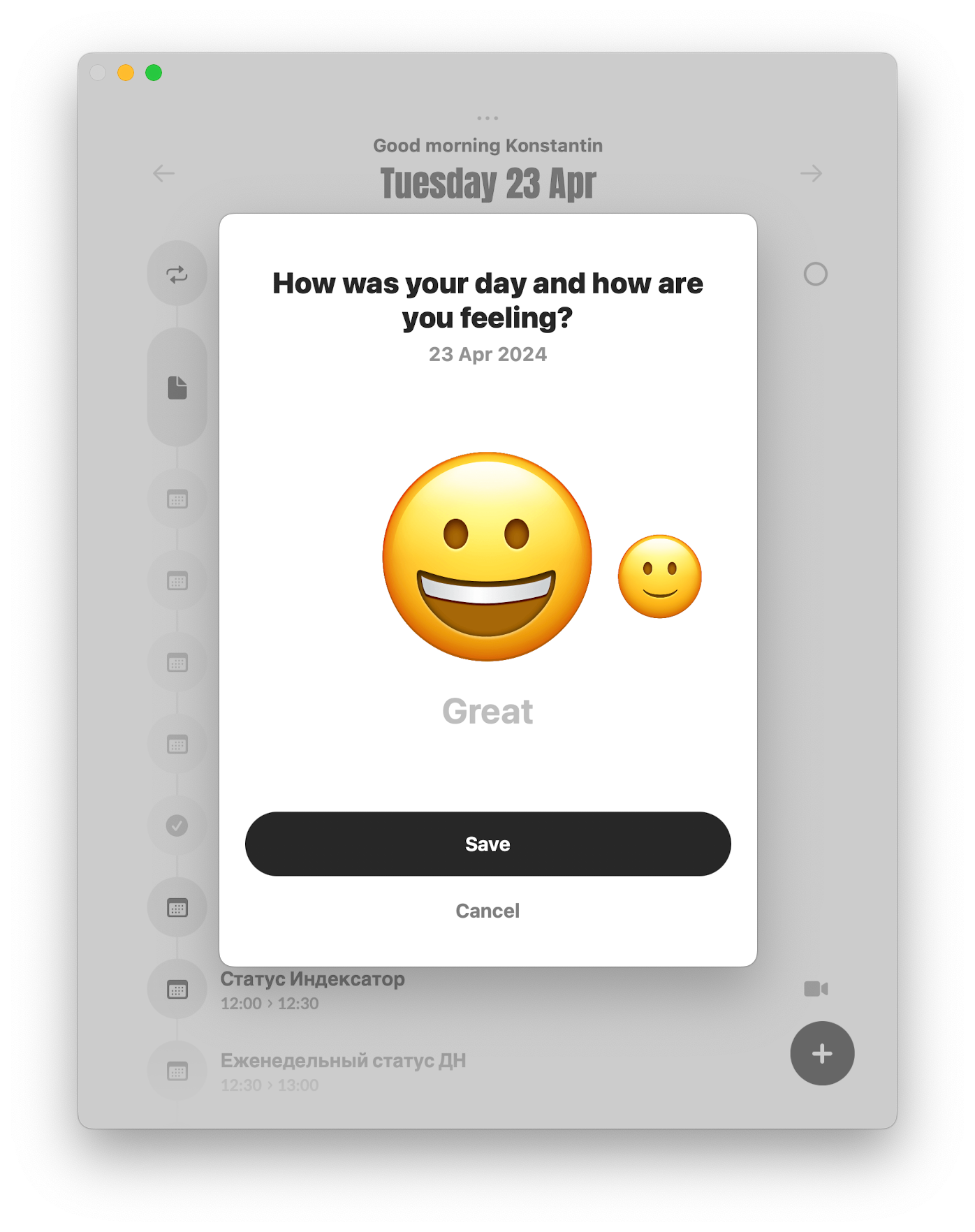 Самый простой раздел приложения. Вам нужно просто выбрать смайлик вашего настроения, и на этом весь процесс завершён.