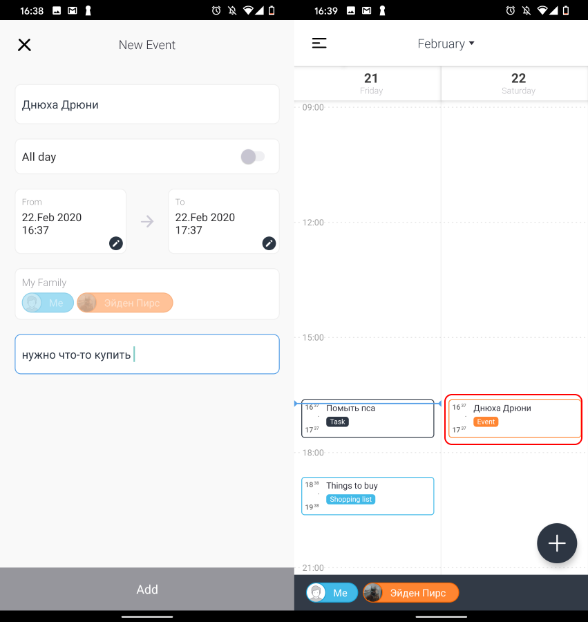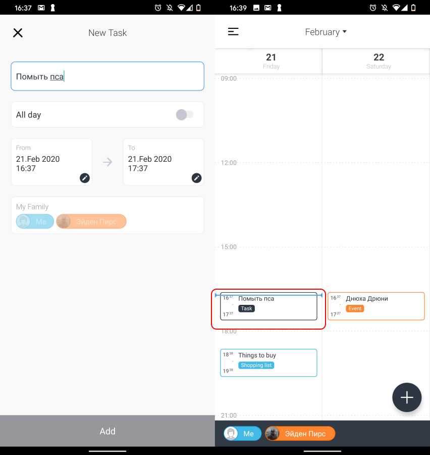 Созданные задачи и мероприятия можно переносить с помощью drag'n'drop на более удобное время. Тапом по имени члена семьи можно быстро отобразить только его задачи.