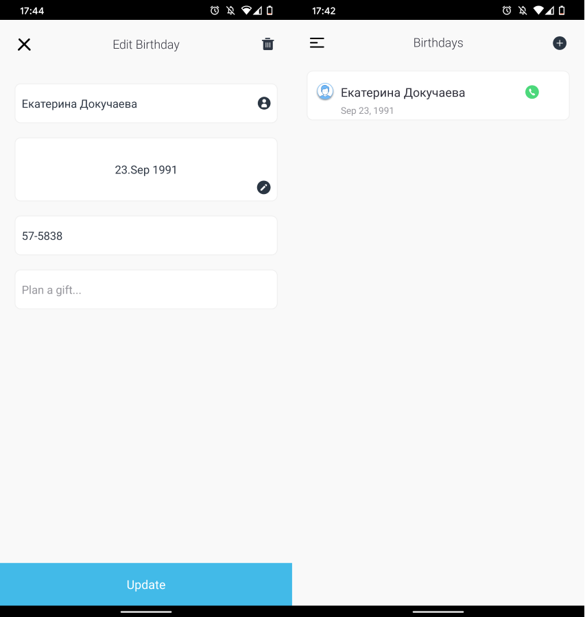 Из раздела «Дни рождения» можно сразу позвонить виновнику торжества и поздравить его. То же самое можно сделать и из списка покупок. Главное, чтобы у контакта был указан номер телефона.