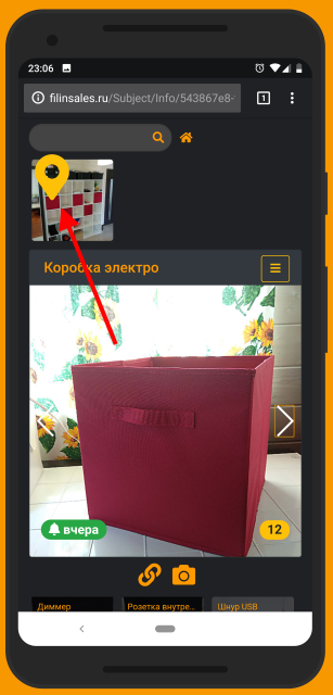 При просмотре карточки вещи она также будет отмечена на общем фото места хранения. Так вы легко сможете понять какая из пяти одинаковых коробок вам нужна.