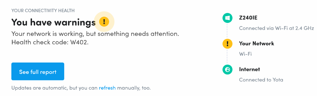 После первого сканирования появится возможность просматривать различные отчёты. Один из таких — Health check reports. Он предоставляет данные о стабильности сети.