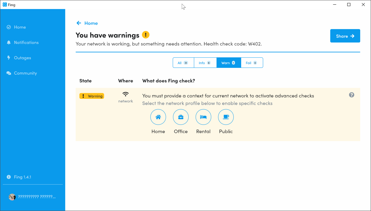 Как выяснилось, я просто не задал контекст сети. Странно, что Fing никак не разделяет предупреждения по уровню угрозы. И непонятно, зачем указывать коды вместо нормального сообщения.