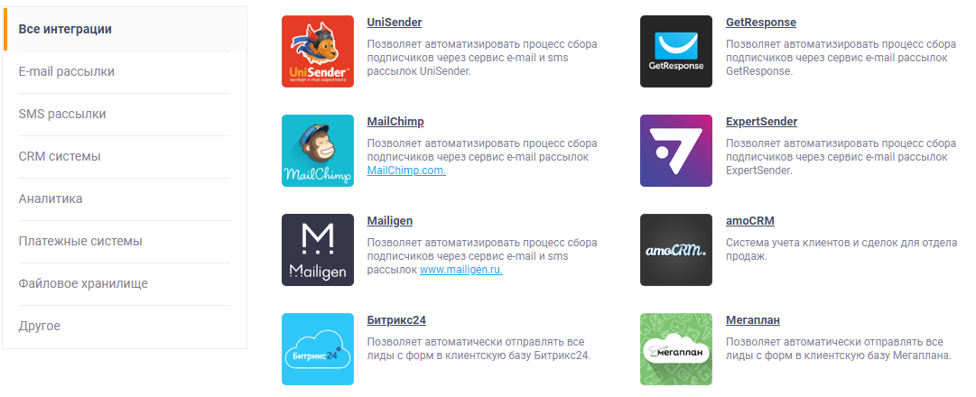 FormDesigner поддерживает интеграцию с несколькими десятками различных сторонних сервисов. Здесь есть сервисы e-mail и СМС-рассылки, CRM-системы, сервисы аналитики, платёжные системы, файловые хранилища и прочее.