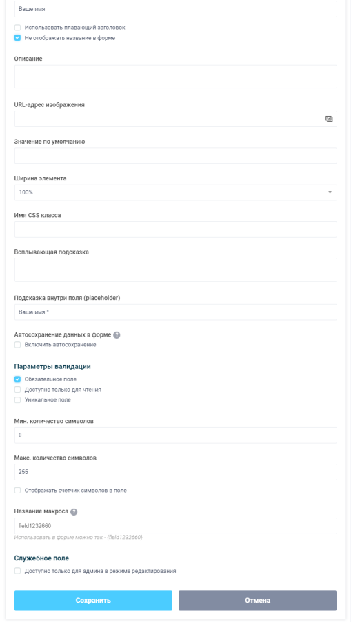 Речь идёт не только о названии, подсказке или типе поля. В редакторе можно управлять визуальным стилем, настраивать CSS-вёрстку, активировать автосохранение данных, добавлять валидацию, управлять количеством символов при вводе, использовать макросы и многое другое.