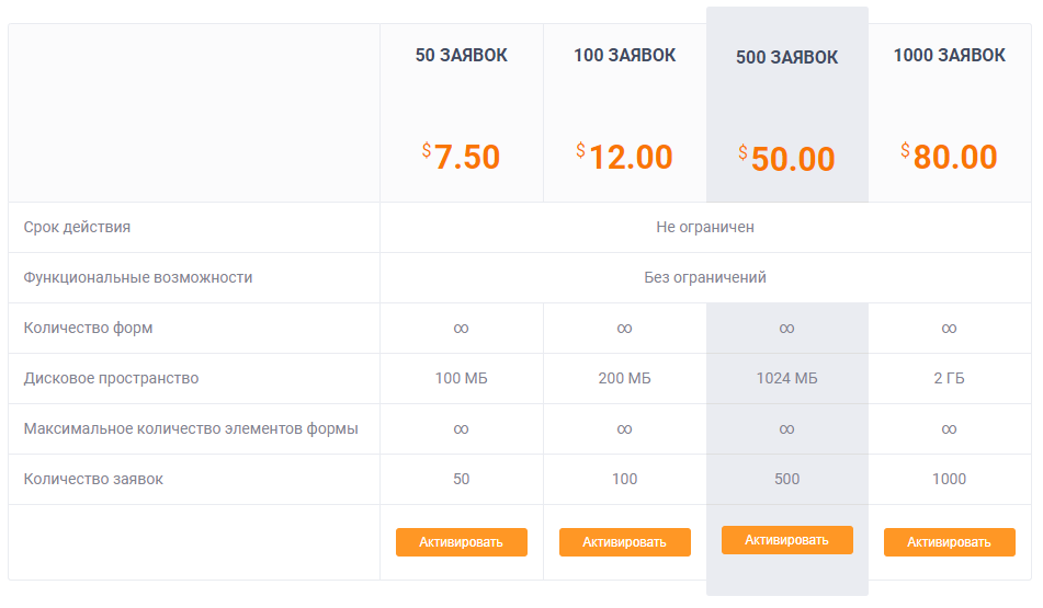 Разница между тарифами в количестве форм, заявок, полей и объёме дискового пространства.