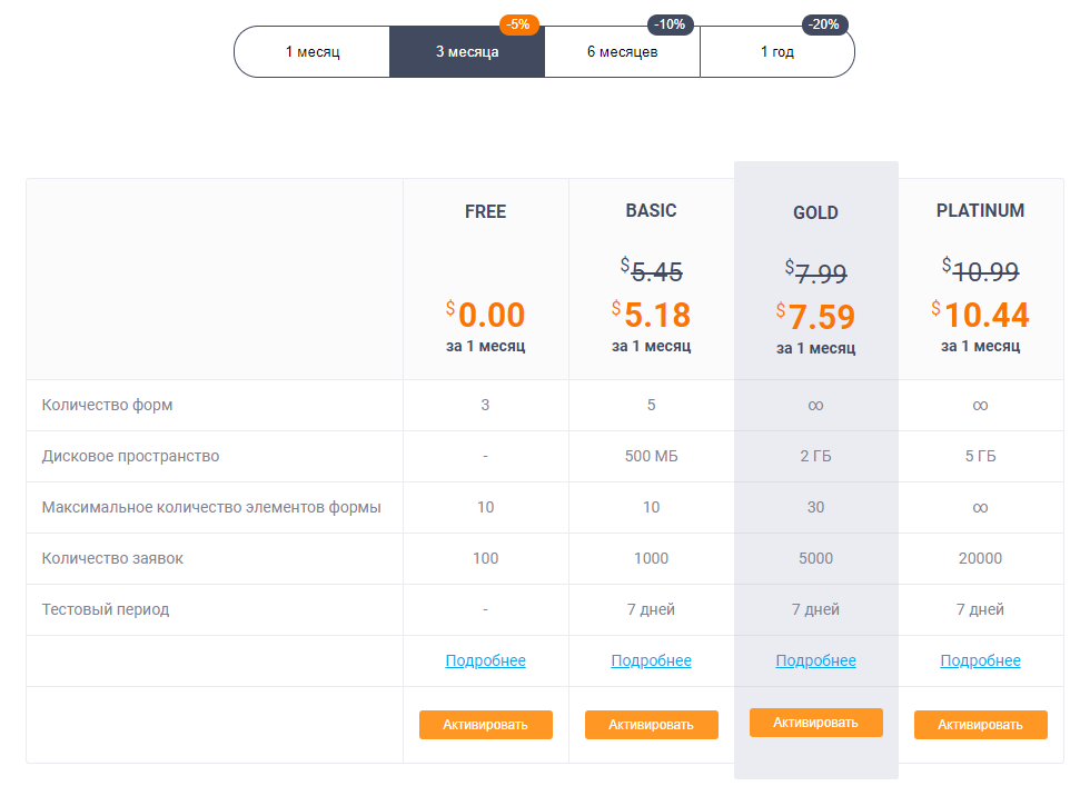 FormDesigner предоставляет четыре тарифных плана, включая бесплатный на месяц. Каждую из подписок можно оплатить на месяц, три месяца, полгода или год.