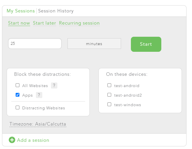 В разделе My Sessions можно задать длительность сессии, выбрать категории блокировок (все сайты, приложения, списки) и выбрать устройства, на которых будет активирована сессия.
